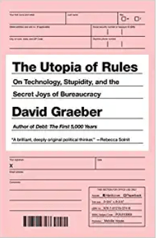 The Utopia of Rules is my favorite of Graeber’s books even if it is a hot mess. In this book Graeber tries to address the strange phenomenon of bureaucracy’s inexorable growth, both public and private. His anthropological training and fieldwork among free peasant societies, his quirky impatient patience with systems around him, and his anarchist spirit give us a wonderfully interesting and depressing view of the growth of red tape. He points out how much of what we call the 60s was a rebellion against bureaucracy and one regularly-betrayed appeal of Reagan conservatism was its alleged rebellion against bureaucracy. After exploring bureaucracy from many angles in a series of more-or-less separate essays Graeber seems to just give up. The books comes to nothing, achieves nothing, proves nothing–but I feel it gave me more to think about than any other book I’ve read in years. No, that’s wrong. It gave me important things to think about that seem completely different from any other book I’ve read in years.